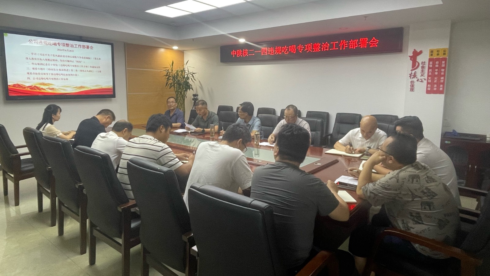 會上,集中學習《習近平關于黨風廉政建設和反腐敗斗爭論述摘編》和習近平總書記關于厲行節(jié)約反對浪費批示要求;傳達學習集團紀委關于印發(fā)《違規(guī)吃喝專項整治工作方案》的通知文件;集中觀看了專題片《持續(xù)發(fā)力 縱深推進》第三季《強化正風肅紀》,剖析近年來查處國央企吃喝亂象典型案例。