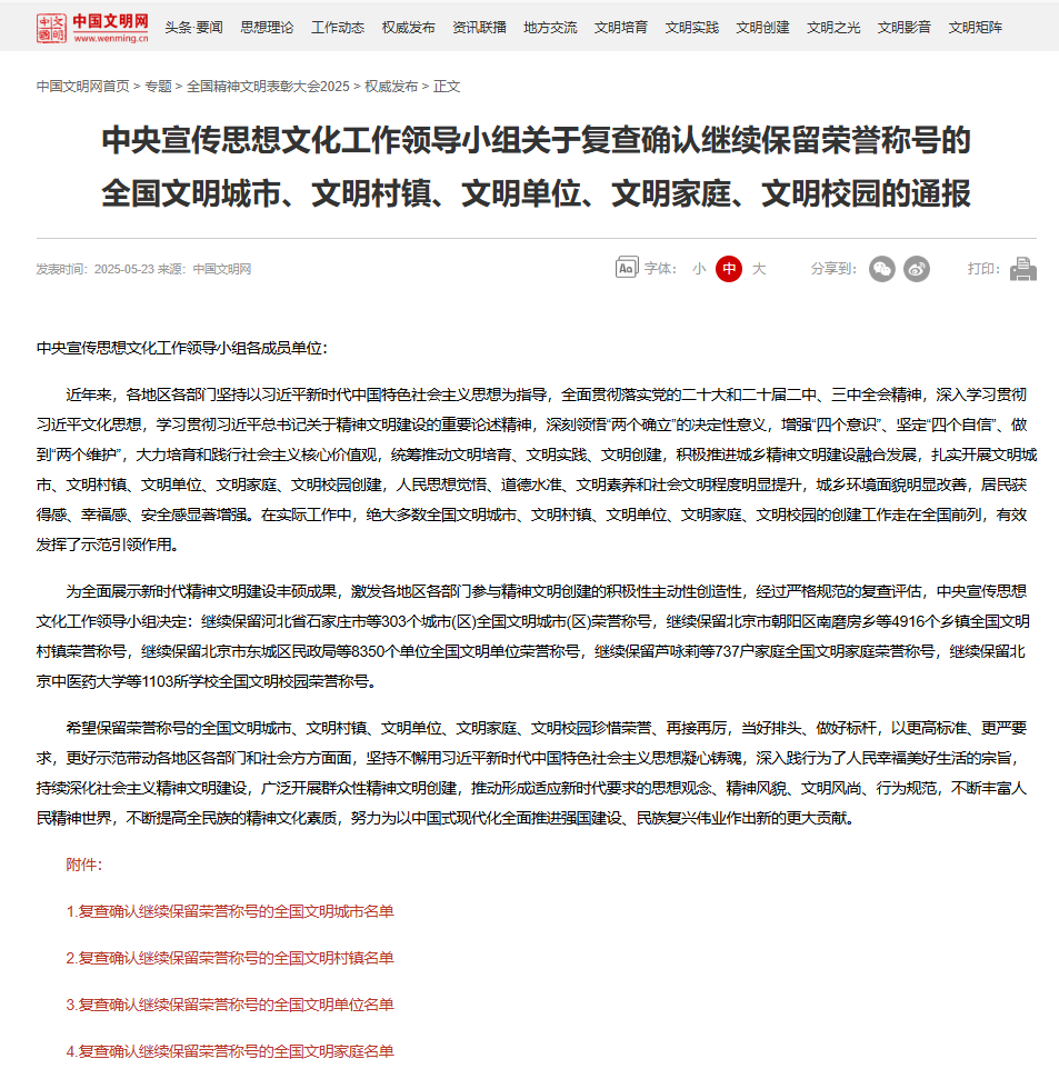 2025年5月23日,全國精神文明建設表彰大會在北京順利召開,中陜核工業集團二一四大隊有限公司經復查確認,繼續保留全國文明單位榮譽稱號。