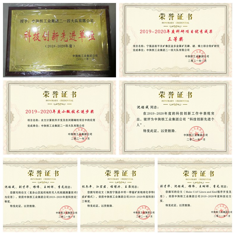 2019-2020年,在公司黨委和領導高度重視和正確領導下,認真貫徹“創新、協調、綠色、開放、共享”五大發展理念,緊緊圍繞科技創新驅動發展戰略,堅持以“產、學、研、管”相結合,以科技為支撐、以人才為根本,以打造成科技創新型、員工知識型、產業環保型企業為指導思想開展公司科技創新工作。一是逐步完善了科技創新管理體系,規范科技創新管理等制度。二是與多家科研院所開展合作扎實推進平臺建設,提高科技創新能力。三是以公司發展需求為導向,借助集團院士工作站平臺,充分發揮公司專業化隊伍建設優勢以及取得的成果,針對項目實施過程中出現的瓶頸問題積極拓寬科研項目申報渠道,增強聯合科技攻關能力。四是注重成果轉化,使科學研究轉化為經濟效能。利用自立科研項目的成果寧陜楊泗廟項目首次在南秦嶺地區發現云英巖型黑鎢礦體,項目得以續作,費用約1070萬元。五是科學規范組織,創先評優不斷進步。基于TRIZ創新方法—低空復雜地形航磁探測技術研究與應用”獲得獲得2020年中國創新方法大賽三等獎,獲得2020年陜西省創新方法大賽一等獎。“無人機航磁系統關鍵技術研究與應用”獲得2020年“灃東杯”陜西省科技工作者創新創業大賽二等獎。“陜西省西鄉縣蔡家梁地區金銅多金屬礦普查地質報告”獲得第十屆陜西省地質學會優秀獎;六是研討交流成為常態,學術氛圍日漸濃厚。