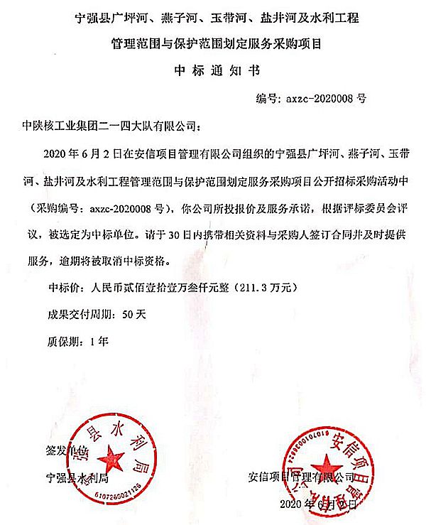 6月2日下午,“寧強縣廣坪河、燕子河、玉帶河、鹽井河管理范圍和保護范圍劃定采購項目”在漢中市招標代理機構安信項目管理有限公司進行公開招標。公司物化探院積極響應本次招標,對招標文件進行了仔細研究,迅速組織技術人員收集相關資料,查閱相關規范,按照要求編寫標書,在短時間內完成了投標文件的編寫及投標工作。從開始確定投標意向,到遞交公司資質和報價,再到開標會上的激烈競爭,經過專家的嚴格評審,公司從多家競標商中力挫其他的競爭對手,成功中標。